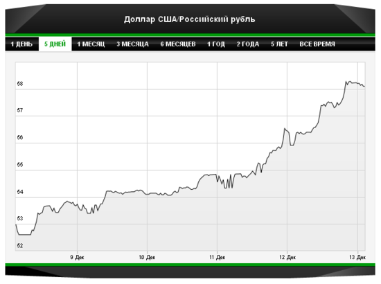 В пятницу с утра стоимость одного доллара достигла 56,9 рубля. В течение дня доллар смог вырасти ещё на рубль, но отметку в 58 рублей так и не преодолел. Евро же смог превысить 71 рубль.